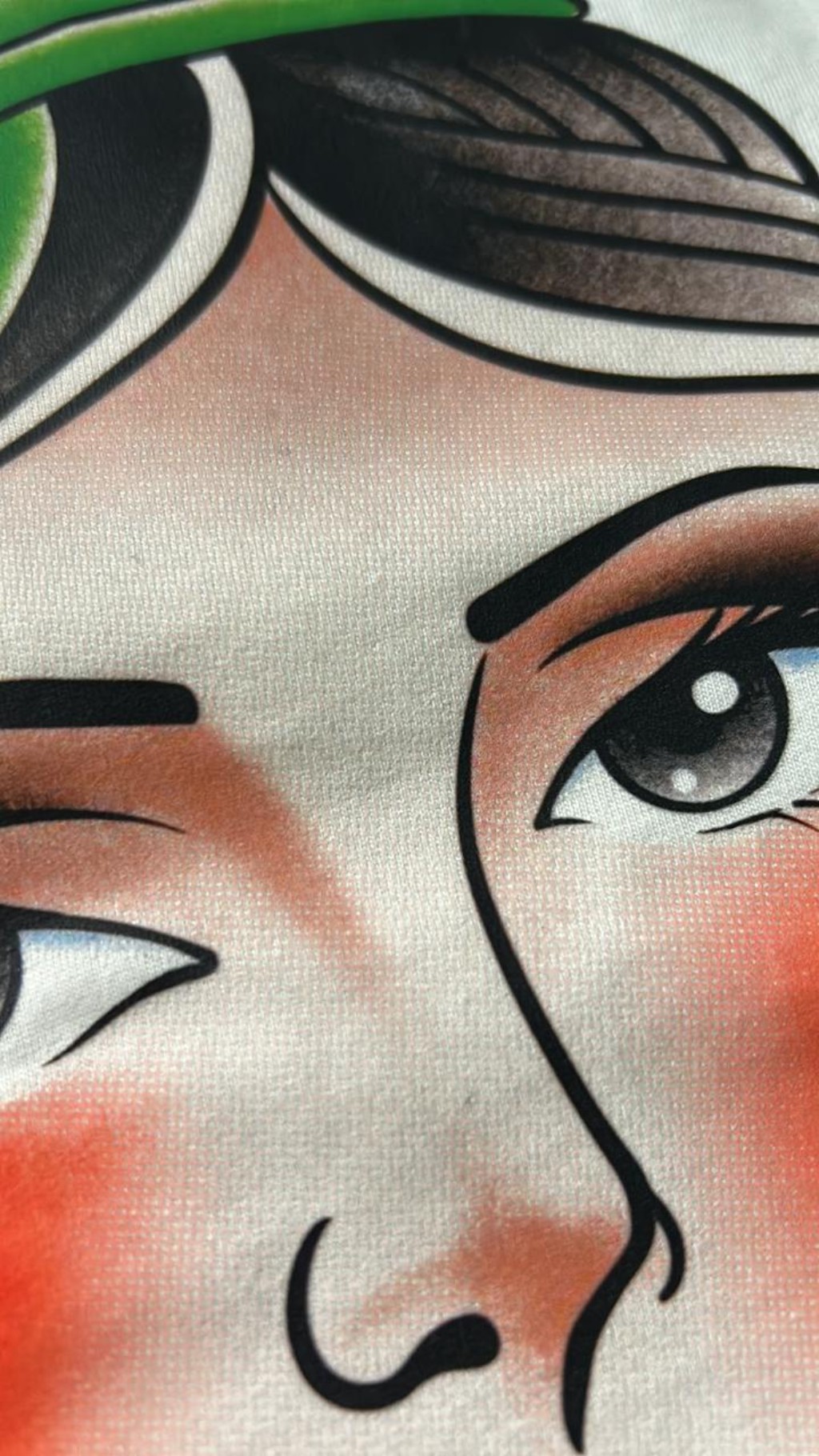 Desta vez, mergulhamos fundo na dualidade do folclore japonês para trazer a figura da Hannya: Um símbolo de fúria e proteção em contraste com a serenidade da nossa Musa. Mas a grande novidade não está apenas na arte, e sim em como decidimos trazê-la para o tecido.