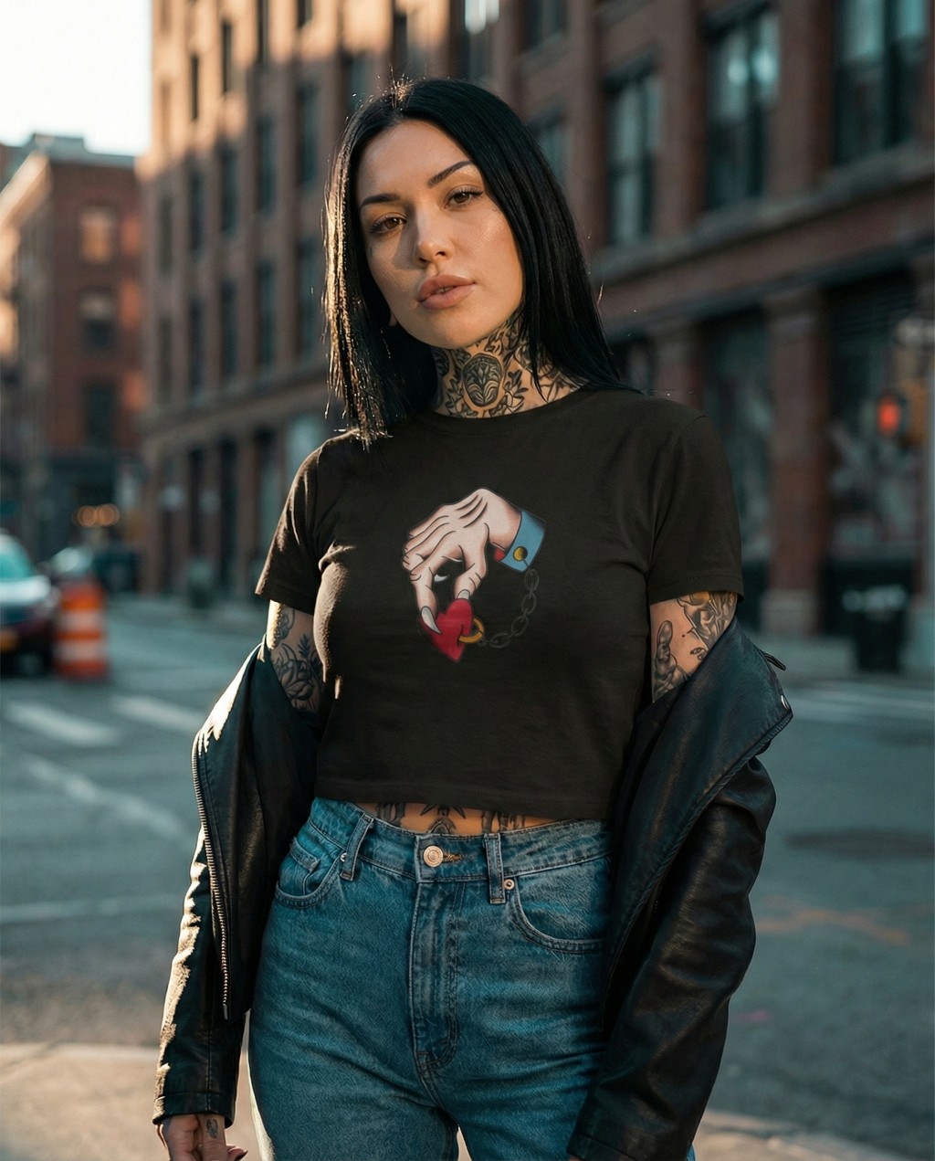 O cropped Prisoner of Love carrega a essência da tattoo tradicional aplicada ao cotidiano. Funciona com jeans, couro, peças minimalistas ou looks mais carregados. É uma estampa que se impõe sem precisar de excesso.